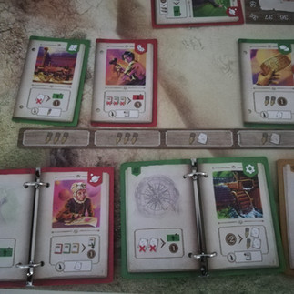 Wichtig sind auch die drei Meilensteine, die farblich mit den Büchern korrespondieren. Hier gilt es, bestimmte Voraussetzungen zu erfüllen. Für jedes der drei Bücher gibt es drei Meilensteine mit jeweils steigenden Anforderungen aber auch steigenden Vermächtnispunkten, die ihr am Spielende erhalten könnt. Aktiv ist immer nur der oben liegende Meilenstein. Ihr könnt Meilensteine freischalten. Wenn ihr dies tut, entfernt ihr den farblich passenden Meilenstein, dreht diesen um und nehmt euch eine der angezeigten Belohnungen. Nun ist der darunterliegende Meilenstein aktiv. Überlegt euch diese Entscheidung gut, denn sie ist unumkehrbar.