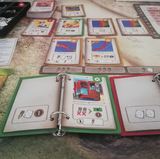 Schauen wir uns ein paar wesentliche Spielelemente an, bevor wir zu den einzelnen Aktionen kommen. Ein Element sind die 3 Bücher aus den Bereichen Wissenschaft, Industrie und Handel. In diese Bücher heftet ihr die farblich passenden Seiten ein, die ihr zunächst aus der Auslage erwerben müsst. Erhaltene Seiten werden dann Oberhalb der Geschichtsleiste platziert und werden so dann zu den verfügbaren Seiten, die ihr in eure Bücher schreiben könnt. Eine neue Seite heftet ihr immer auf die aktuell obenliegende Seite.