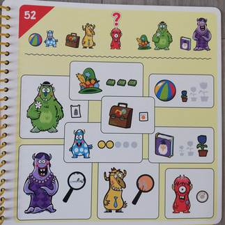Neben dem Haus, den Monstern und deren Lieblingsgegenständen ist der große Spiralblock das spielentscheidende Element. In diesem findet ihr satte 60 Rätsel, die es zu lösen gilt. Die Aufgaben sind in drei Schwierigkeitsstufen unterteilt. So gibt es 30 einfachere Aufgaben, 20 mittelschwere Aufgaben und 10 schwere Aufgaben. Doch auch innerhalb der einzelnen Schwierigkeitsstufen ist ein Anstieg festzustellen. So gilt es, zum Beispiel, im Rahmen der ersten Aufgaben zunächst nur Wanda zu platzieren und dann kommen auch schon weitere Figuren ins Spiel.